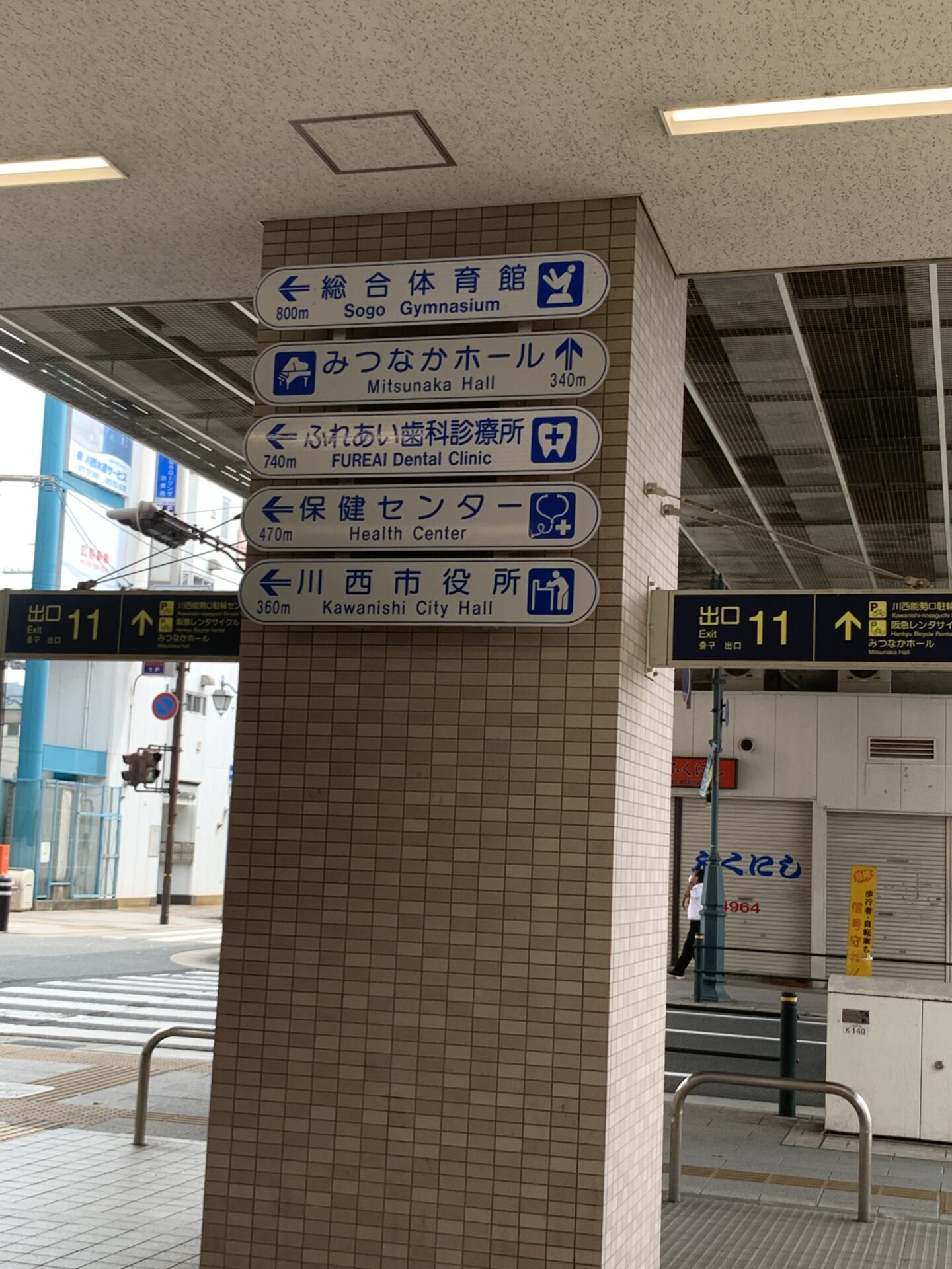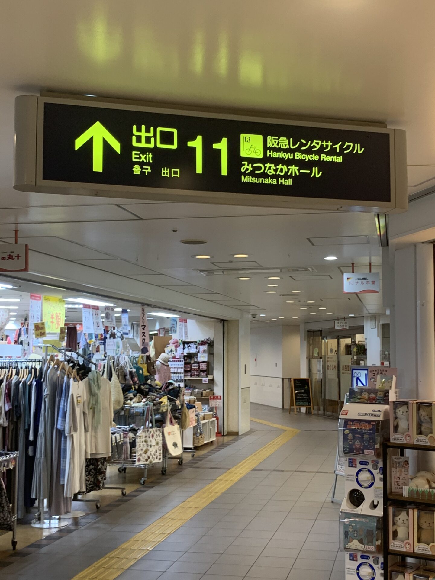 この写真は11番出口を出たところにある案内板です。みつなかホール方面に向かって阪急電車の高架下をお進みください。