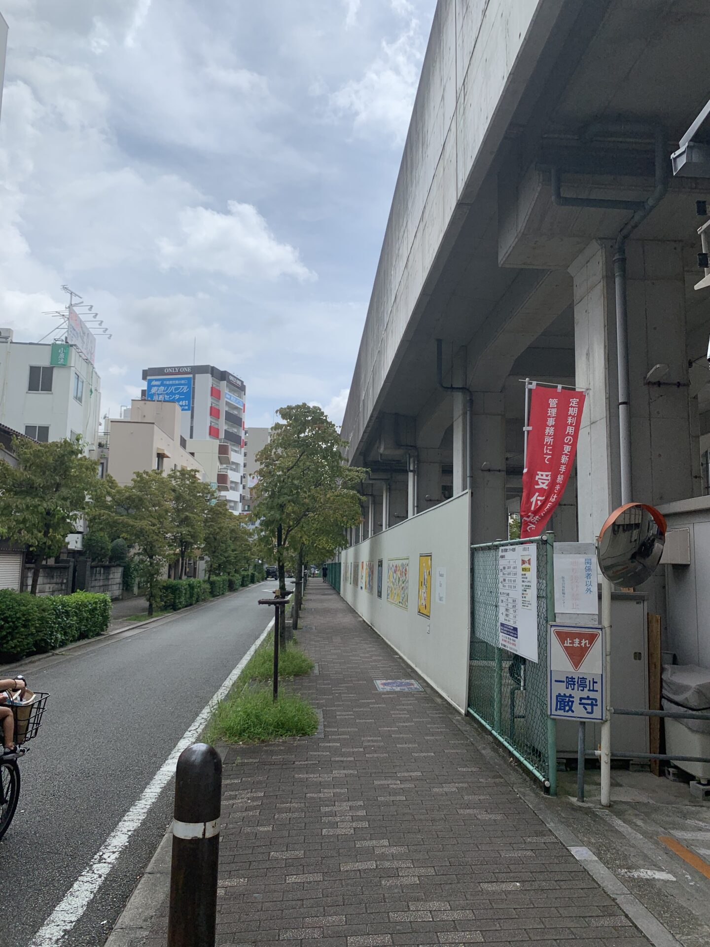 この写真は、みつなかホール方面に向かう阪急電車の高架下の道路の写真です。